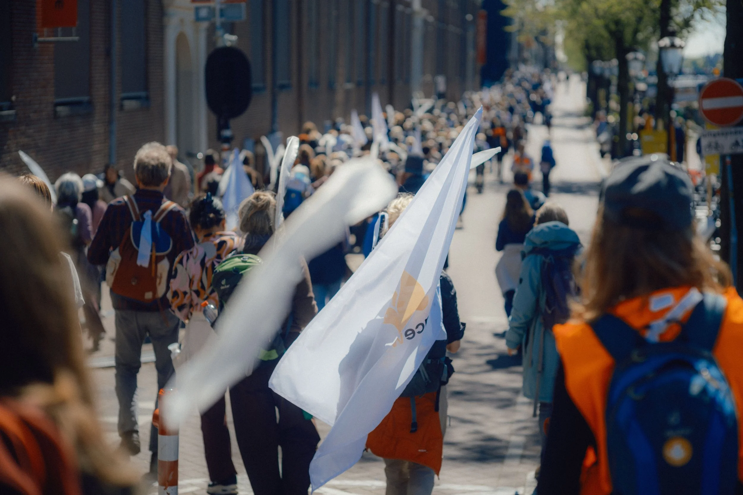 Ik wordt gewenkt en voorgesteld aan een man in een rolstoel. Hij is bijna honderd, zijn stem is nog vast en zijn ogen staan helder. Hij viert binnenkort zijn verjaardag en heeft besloten dat mensen hem geen cadeau’s moeten geven, maar moeten geven aan de Peacewalk. Of ik een kort tekstje voor hem heb, want op de website staat veel te veel. Natuurlijk. Een vrouw is zes maanden zwanger en loopt het met haar vader. Een gezin met een wandelwagen, de kinderen lopen veel – en zitten soms trots boven de kar. Onderweg met papa en mama. We weten eigenlijk niet eens goed wat we hier mee maken, maar willen hier voor geen goud weg. Soms moet het, vandaag begint de werkdag. Maar iedereen die meeliep lijkt alweer plannen te maken voor de volgende etappe.